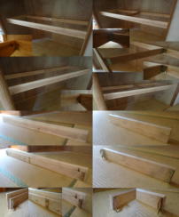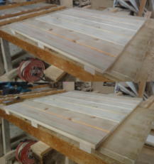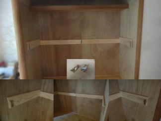 | 正面斜め全体(スノコ) 幅600o×奥行630o×高さ32o ↓ 幅568o×奥行630o×高さ32o スノコ 3台をお客様にご用意していただ き、中棚の枠に入るように幅を小さくいたし ました。 |